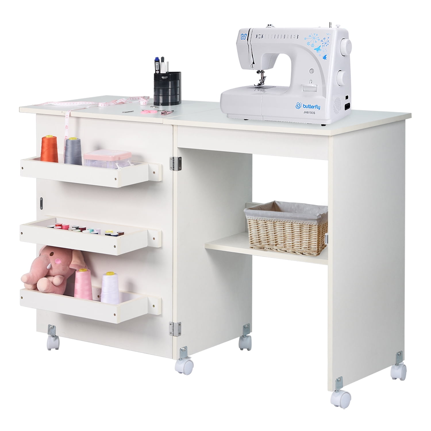 Amazon Com Folding Sewing Table Multifunctional Sewing Machine Cart Table Sewing Craft Cabinet With Storage Shelves Portable Rolling Sewing Desk Computer Desk With Lockable Casters White Arts Crafts Sewing