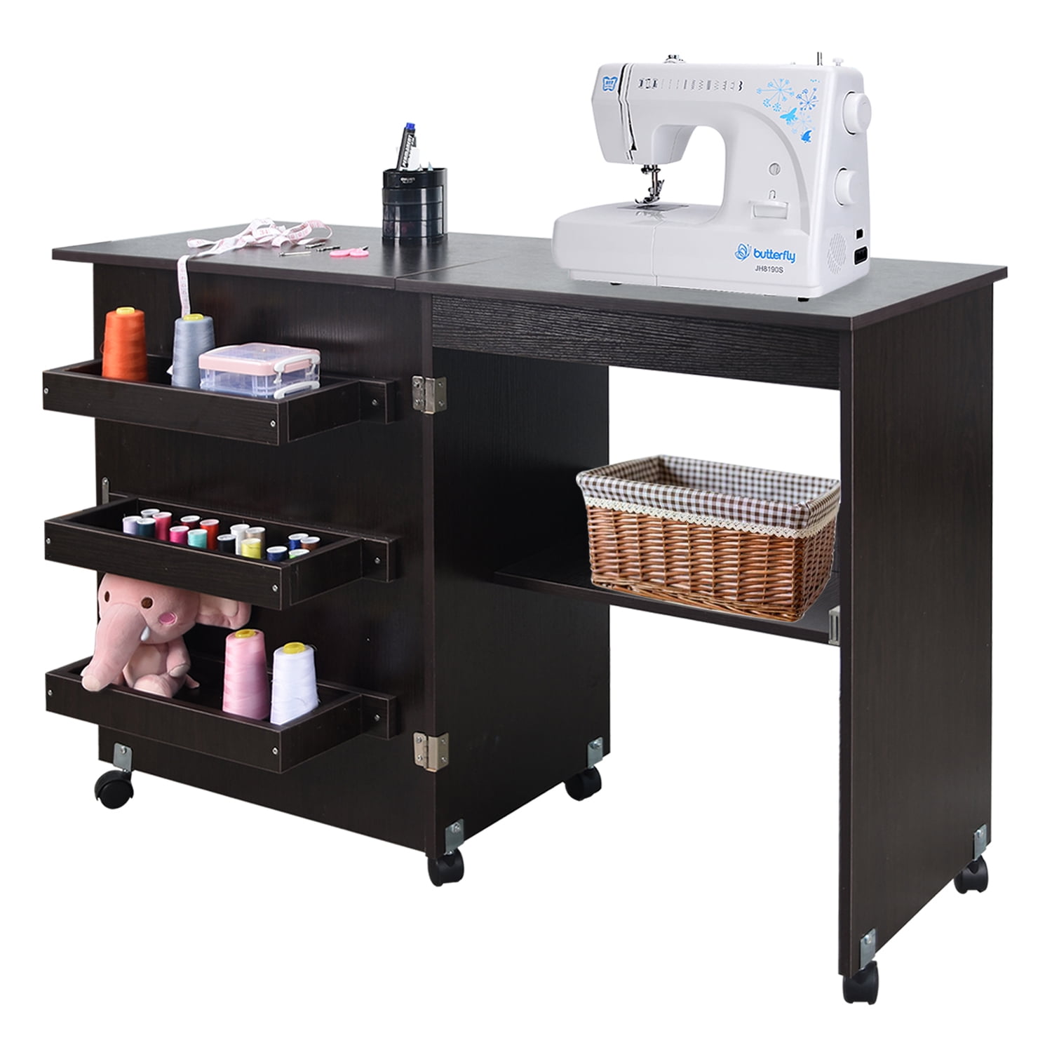 S Fyronti Folding Sewing Craft Table With Storage Shelves And Lockable Wheels Brown Finished Walmart Com